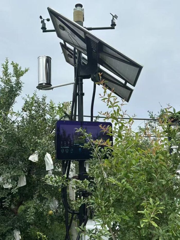 传感器+气象站:给石榴树装上“智慧大脑” 在临潼科技园300亩石榴示范基地内,“大红甜”“骊山红”等12个品种分区种植,每块区域均配备土壤湿度传感器、微型气象站及虫情测报灯。