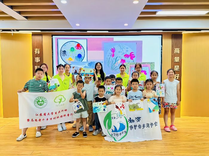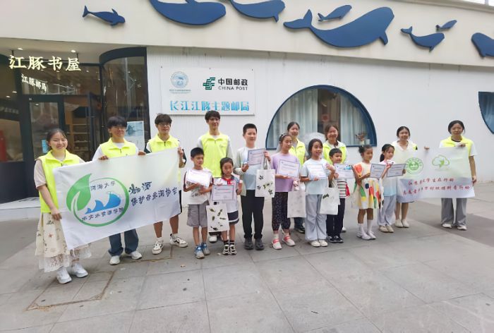 7月8日小分队还赴南京江豚保护中心开展“守护长江,与你‘童’行”宣讲。队员讲解长江生态意义、江豚习性与生存挑战,让孩子们明白“护长江即护江豚”的道理;随后带领孩子进行“共建江豚新家园”植物帆布拓印活动,在创作中加深对江豚的喜爱,让环保理念落地生根。