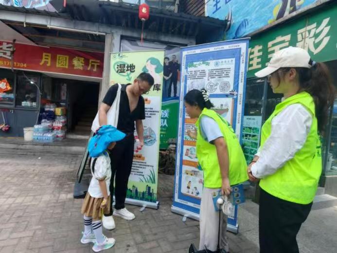 活动伊始,小分队在市场入口处布置了“湿地碳汇”“碳达峰、碳中和”等内容的科普展板,吸引了众多游客与市民。队员们化身科普讲解员,以生活化的语言深入浅出地介绍湿地作为“碳汇明星”的原理及其在“双碳”目标中的重要作用,有机衔接宏观生态策略与微观植物功能,讲解获听众连连称赞。为进一步提升公众环保意识,队员们分散于市场之中,围绕新污染物的种类与危害进行讲解,并发放宣传手册20余本。他们从日常物品出发,直观阐述新污染物的来源与影响,使生态保护理念深入人心。