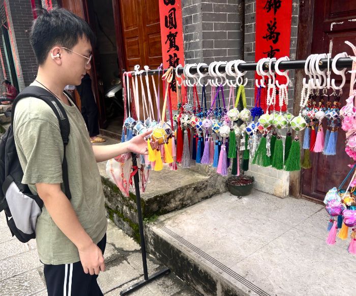 三、街头绣球摊“映活力”,见证文旅融合的民生温度 漫步旧州古镇绣球风情街,沿街商铺挂满了色彩艳丽的绣球,其中72岁的韦奶奶经营的摊位格外引人注目。韦奶奶指着摊位上的绣球向实践团介绍,从20元的迷你挂饰到120元的装饰绣球,款式丰富多样,其中与乙游联名的绣球最受游客青睐,“一天能卖二三十个,年轻人就喜欢这种新鲜有创意的样式。” 与此同时,实践团在风情街开展问卷调研,回收的150余份有效反馈显示,80%的游客购买绣球是为了留作纪念或赠送亲友,还有不少游客提出希望增设“绣球制作体验课”。韦奶奶的摊位,正是旧州古镇“民俗传承”与“文旅消费”双向赋能的生动缩影:手工绣球既守住了文化本真,让传统技艺得以延续,又为当地居民带来了稳定收入,生动诠释了物质文明与精神文明协同发展的深刻内涵。