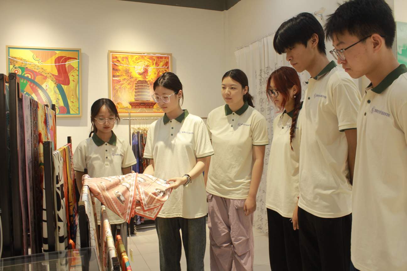 展厅内,实践团依次参观了"丝韵华章"丝巾艺术展区、"匠心文创"产品展示区和"材质百科"面料科普区三大主题展区。在丝巾艺术展区,"齐风雅韵"系列丝巾以淄博陶瓷纹样、周村古商城建筑为设计灵感,通过传统提花工艺与现代数码印花技术结合,呈现出传统与现代交融的美学魅力;文创产品展区陈列了丝绸书签、杯垫、装饰画等20余件创意作品,其中融合鲁派内画工艺的丝绸屏风格外引人注目;面料展示区则系统呈现了19姆米重磅真丝、6A级桑蚕丝、柞蚕丝混纺等8类材质样品,并设置触感体验装置,让参观者直观感受不同面料的质地差异。