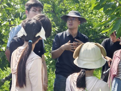 结合多学科交叉优势,实践队开展田间课堂与实操训练。在教师带领下,队员学习樱桃树精细化管理技术,包括科学压枝和树形改造等方法,以优化树体结构、改善光照条件,提升果品产量与质量。同时,生物学院教师组织樱桃深加工技术培训,涵盖樱桃酒酿造等环节,实践队在此基础上撰写产业发展报告,提出开发功能性产品与建立质量溯源体系等建议,为提升产品附加值提供支持。