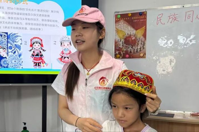 志愿者还讲述“彝海结盟”等民族团结历史故事,阐释“像石榴籽一样紧紧抱在一起”的内涵。绘画环节中,学生就苗族、维吾尔族、蒙古族等少数民族相关内容提出疑问,展现对民族文化的关注。