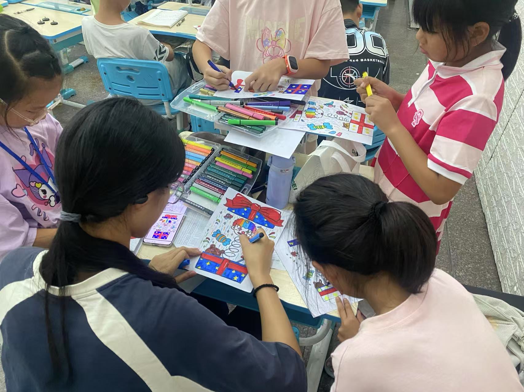 在这场温暖而充满真诚的陪伴中,队员们不仅耐心辅导孩子们完成暑假作业,更通过绘画启迪心灵、传递关怀。每一道题目的讲解,每一次创作的引导,都在帮助孩子们巩固知识、激发想象,让他们在画纸上自由表达天马行空的创意。团队与孩子共同学习、共同创作,在作业与艺术交织的时光里,建立起深厚的信任与情感。