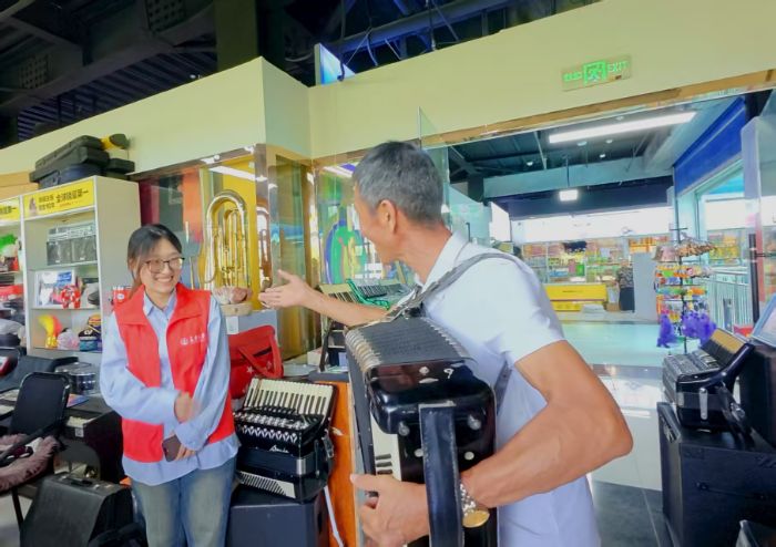 12日,实践队赴伊宁市喀赞其街道汉人街大巴扎开展“多民族商业街区文化共生”专题调研。大巴扎形成于清乾隆年间,现有固定商户512户,涉及汉、维吾尔、回、哈萨克、乌孜别克、俄罗斯等9个民族,日均客流1.2万人次。这里是多个民族的文化印记,是各民族文化交流融合的生动见证。成员们漫步街巷,走进老字号店铺,在乐器行中,欣赏到了造型精美的冬不拉和琳琅满目的手风琴。手风琴表演艺术家何立志老师的精彩演出将活动推向高潮,他激情演奏民族音乐,展现了哈萨克族同胞的热情与才华。校吉他社负责人赵博浩在何老师指导下,成功奏响手风琴简单曲调,师生们还一同唱响《我们新疆好地方》,悠扬的琴声与歌声成为连接各民族心灵的桥梁。
