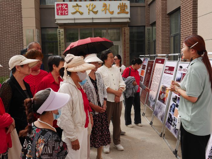 活动现场,团队成员首先为社区居民细致讲解精心制作的展板内容。展板围绕新疆在抗日战争中的重要贡献展开,从新疆作为西北国际交通线关键枢纽,承担超80%苏联援华物资转运任务的“红色通道”作用,到当地军民捐款捐物、成立抗日救国后援会、修建航空基地、保障战略物资生产,以及各族群众在抗日民族统一战线号召下开展救国运动等方面,生动再现了那段波澜壮阔的历史,让社区居民深入了解新疆为全国抗战作出的不可磨灭贡献,激发大家的民族自豪感与爱国情。