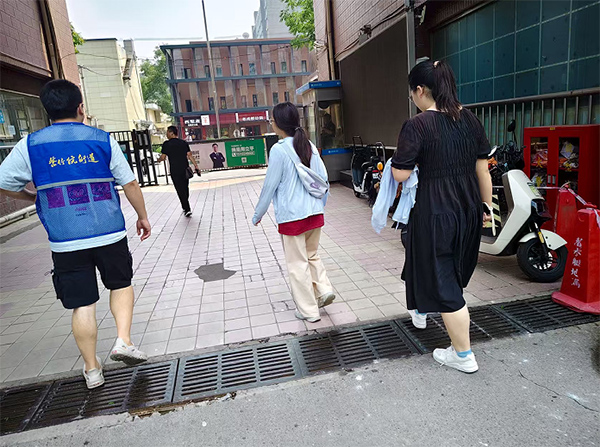 团队记录了社区内多种植物,如栾树、丁香、圆柏、山杏、碧桃、悬铃木、玉兰等,观察植物形态、是否有吊牌以及适老化优势与不足。他们希望通过合理的植被配置,为老年人提供更舒适、安全的活动空间。调研团队检查社区内道路是否适合老人行走,是否有坡道等。他们发现部分社区的步道存在坡度过大、路面不平等问题,给老年人的出行带来不便。