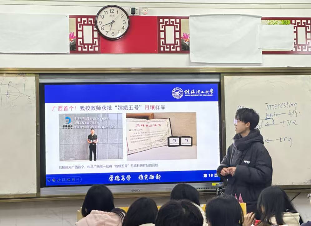 图为宣讲团成员在教室中,面向同学们讲解桂林理工大学获批“嫦娥五号”月壤样品这一科研成果,展示学校科研实力。黄琳惠供图