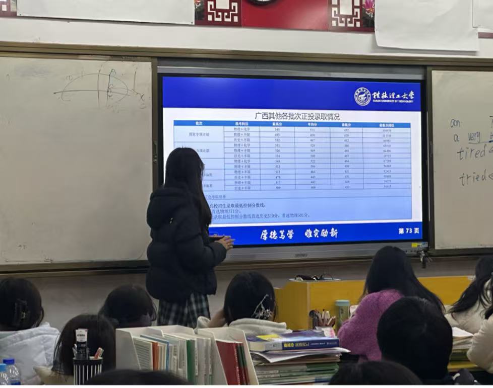 图为宣讲团成员在教室中,对着同学们讲解桂林理工大学在广西其他各批次的正投录取情况,分享学校招生信息。陆祥飞供图