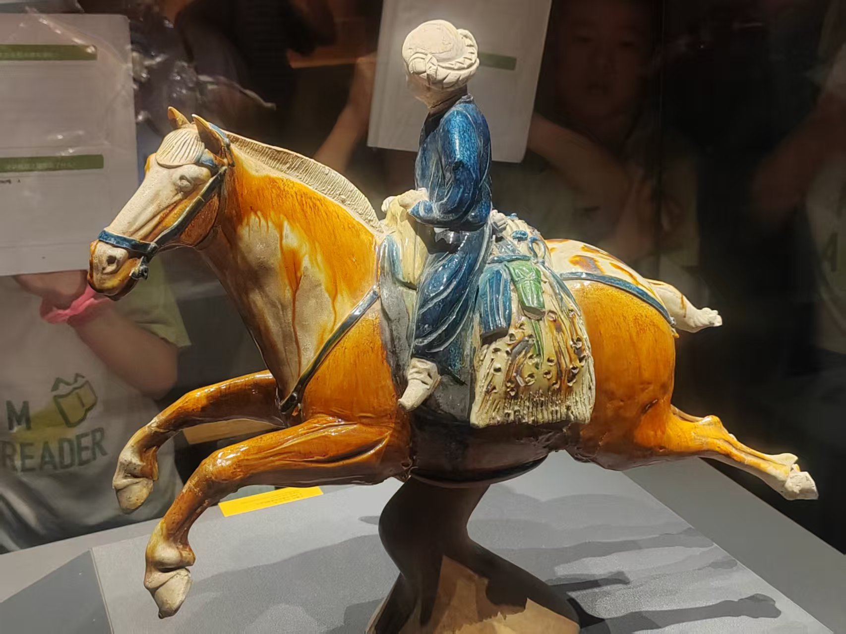 步入展厅,承载着千年时光的文物依次铺展:唐代彩绘侍女俑发髻高挽、衣袂翩跹;《客使图》壁画上,各国使者神态各异;而造型独特的唐三彩载乐驼俑,更是以驼背上乐手演奏的姿态,生动再现了唐代中外文化交融的场景,瞬间将队员们带入十三朝古都的时光长河。大家或扫描展柜二维码聆听沉浸式解说,或围站在公益讲解志愿者身旁认真学习,在“听与思”的互动中,厘清文物背后的时代脉络,深化对传统文化的认知。