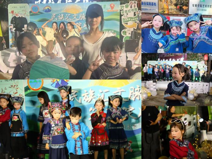 8月4日晚会当日,研学团队公益组织及当地村民逾百名观众汇聚一堂。晚会以民族T秀拉开帷幕,当地辉岩民族小学学生身着布依族服装、浙江宏升升研学团队手拿布依族日常用物、浙江平阳商会小代表身着国家级非遗枫香染工艺制作的精美服饰参与走秀。这场由布依族、汉族共同参与,贵州、浙江两地携手呈现的走秀,生动诠释“民族的就是世界的”理念,展现各美其美、美美与共的民族文化交融图景。