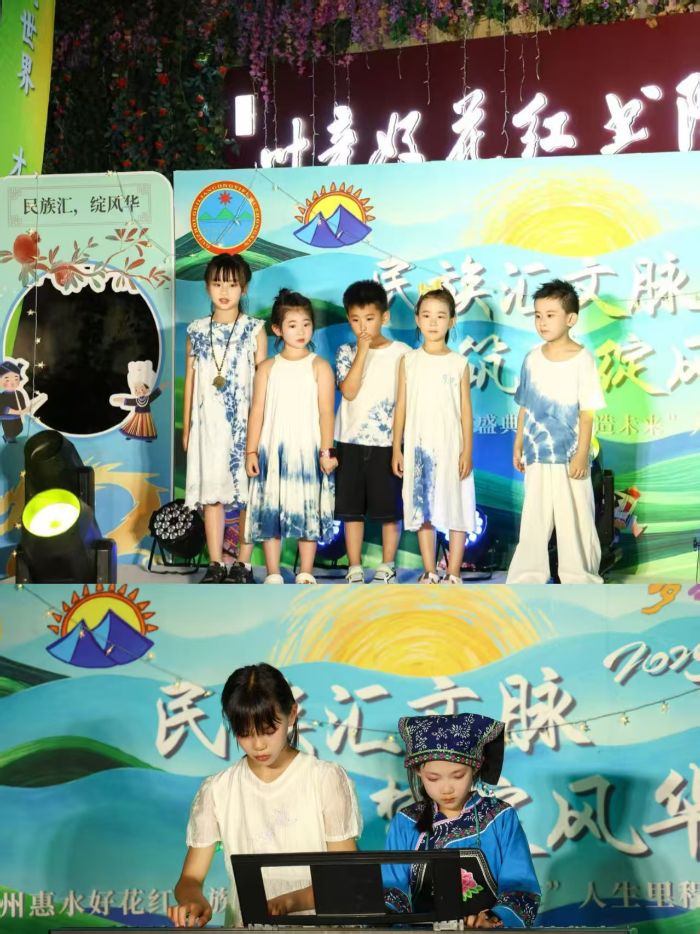 后续节目接连登场,陶笛《小星星》与合唱布依族歌曲《好花红》融合表演,借陶笛旋律与《好花红》对生活美好祝愿的呼应,传递民族自豪感;双人合奏中西方不同风格钢琴曲,以音乐交织彰显民族魅力;布依族孩子演唱《惠水谣》,抒发对民族之美的赞叹;辉岩民族小学学生身着布依族服饰朗诵《少年为何读书》,展现青春担当。
