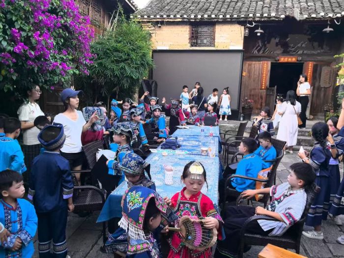 8月1日至8月3日,文艺晚会筹备工作紧锣密鼓开展。此次晚会由杭州宏升升教育科技有限公司主办,叶辛好花红书院与辉岩民族小学联合承办,红石榴志愿队承担为布依族孩子策划表演节目的任务。志愿队通过逐班询问,挖掘孩子技艺特长。围绕民族文脉深刻理念,创新多个预设民族类节目,其重点节目为“民族村T”走秀活动,通过身着民族服饰及手持民族器物,展示文化自信。