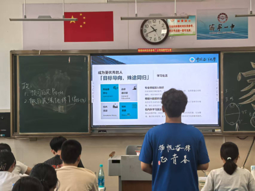 现场宣讲大学概况与专业知识 8月20日,伴随济宁一中校园铃声,宣讲正式开启。考虑到宣讲对象是文科班学子,实践队在内容呈现与形式设计上贴合其认知特点与兴趣点,以“学校推介+专业解读+生涯指导+互动答疑”四维模式,带来干货满满、生动有趣的升学规划课。