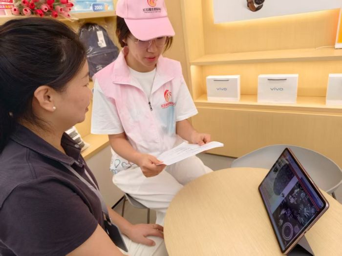8月27日,志愿队首先在宝应县吾悦广场vivo线下门店开展文化宣传活动。志愿者们身着统一服装,借助门店平板设备展示侗族特色图案,包括侗族刺绣纹样、鼓楼建筑轮廓等文化符号,向顾客详细讲解图案背后的文化寓意。例如,侗族刺绣中的花鸟图案象征着对自然的敬畏,几何图形则代表着民族的历史记忆。此外,志愿者还通过文字资料补充介绍了侗族的传统节日,如萨玛节的祭祀流程、合拢宴的热闹场景,以及侗族大歌的多声部合唱特色,引导顾客从多角度深入了解侗族文化。