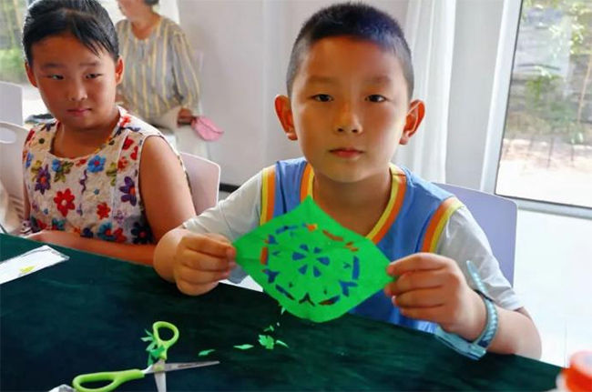 三、巧手剪非遗,布绢开青花 在一系列动脑的知识结束后,志愿者又展开了胶南剪纸、传统蜡染的动手工艺。承载了古往今来的美好祝愿的小小的剪纸,也在孩子们的创意下开出了崭新的花。在志愿者的耐心指导下,一幅幅精美绝伦的剪纸作品得以出现。