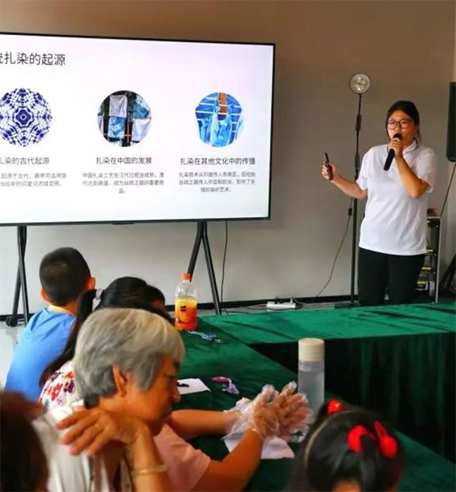 同时,另一项传统非遗——扎染也让孩子们惊艳又好奇。用简单的皮筋将布紧紧地扎起来,浸入染缸,图案精美的扎染就这样制作成功。看着被传统非遗文化深深吸引的孩子们,实践团成员心中充满自豪。