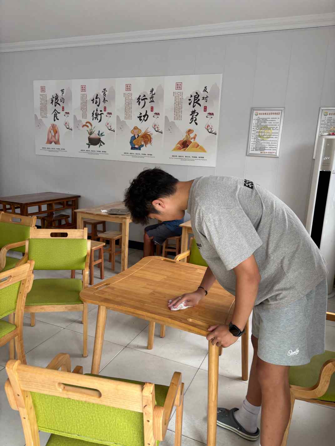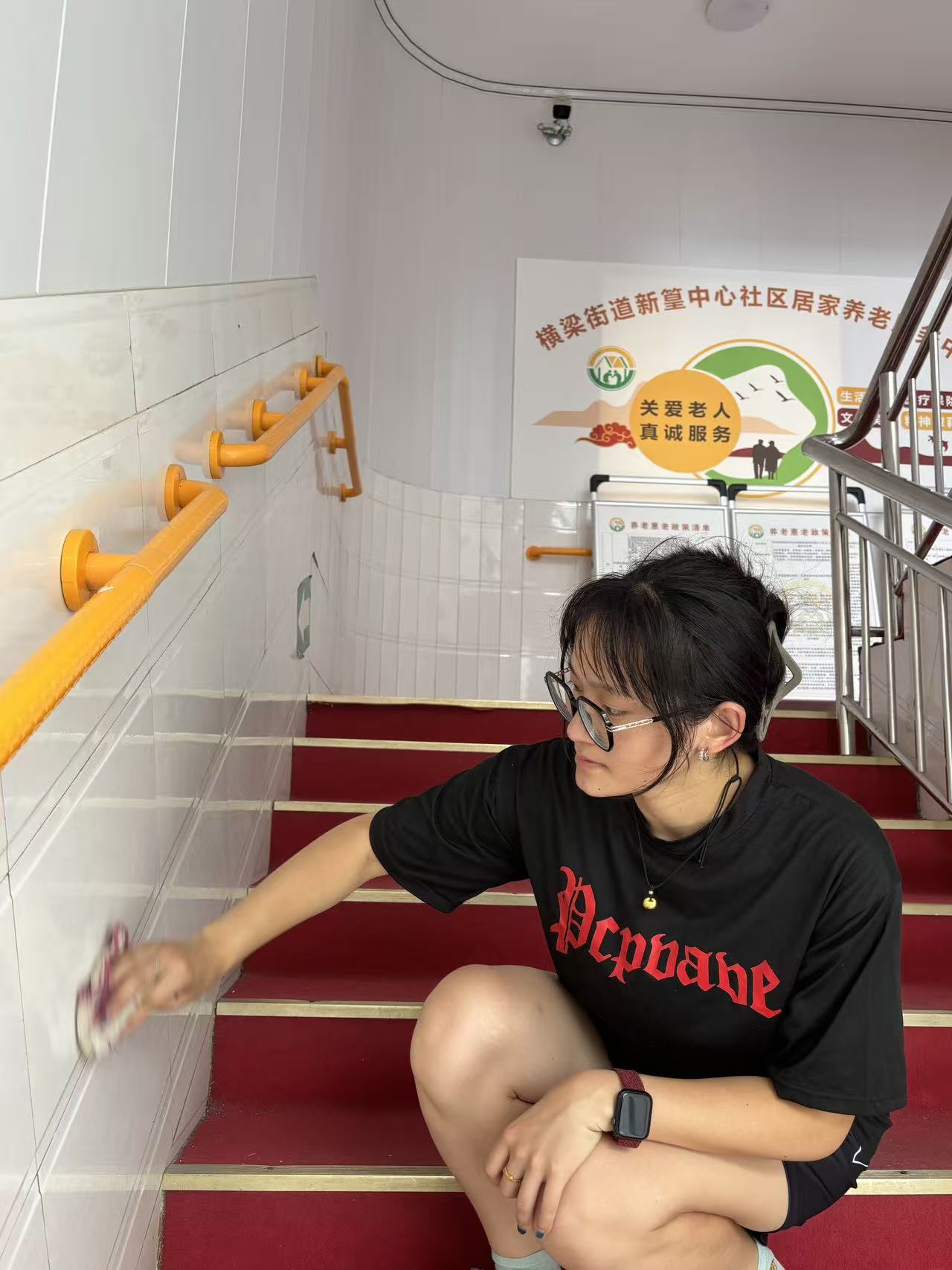 实践团成员首先投身社区环境提升行动。他们手持清洁工具,认真清扫公共区域、擦拭宣传栏、整理便民桌椅,不放过任何一个卫生死角。尽管天气炎热,大家依然干劲十足,在劳动中锤炼意志、培养担当。他们不仅用实际行动美化社区环境,也更深刻理解了绿色环保需要每个人的参与和坚持。