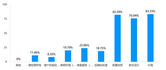 在参观调研过程中,调研组还向正在逛街的顾客发放了调研问卷,具体调查湘派服装传统批发市场消费行为与需求。据调查问卷与实地采访显示,在批发市场购物时,价格是影响购买的最主要因素,83.33%的顾客最关注价格;次之是服装的质量材质和款式设计,占比分别达到82.29%、76.04%,远高于18.75%的品牌知名度等因素。由此可见,金冠服装城是靠真诚的价格、质量材质和款式设计深深打动了顾客。