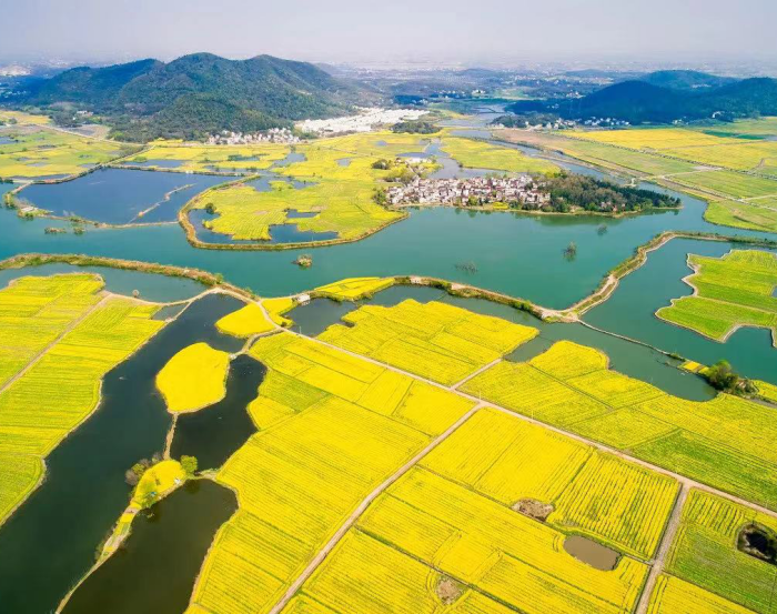 生态打底,让乡村留住本色。航拍视角下的龟山村,形似一只静卧水面的灵龟,被泊口河温柔环抱,青山碧水与绿野金花构成天然画卷。村庄秉持“绿水青山就是金山银山”理念,在环境整治中注重保留乡土韵味,不仅完成了全村道路的硬化绿化,更精心打造了鹅卵石环村步道。村边坡地的杉木与松林中,成群鹭鸟在此筑巢栖息,与错落有致的民宿相映成趣,推开民宿窗户便能望见响水涧开阔的水面与彩色农田,尽显“水上浮村”的田园诗意。如今的龟山村,春有油菜花海,冬有雪景如画,四季皆景的生态优势正转化为发展优势。