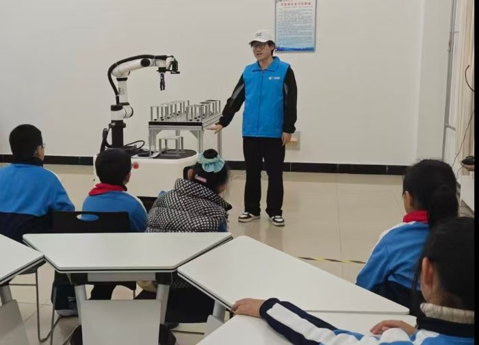 图7 小学生在机器人产业学院观摩机械臂精准分拣演示