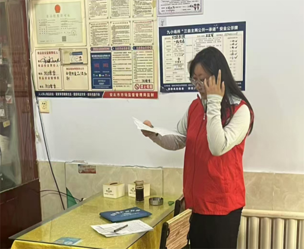 图为实践团成员常敬晗在对个体工商户消防安全进行打分