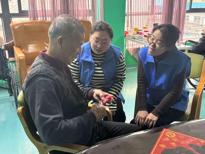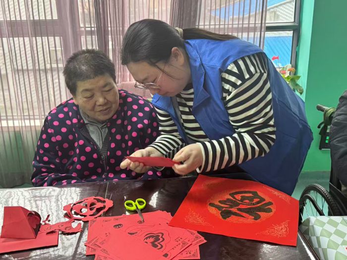 剪窗花环节是老人们最期待的项目之一,薛雯雯早已提前练习了多种基础窗花样式,准备好安全剪刀、彩纸等材料。她注意到角落里坐着一位视力不佳的老人,正对着彩纸面露难色,便立刻走上前轻声询问:“奶奶,我来帮你一起剪好不好?”得到应允后,她坐在老人身边,将彩纸裁成合适的大小,手把手教老人折叠。“奶奶,您看,先把纸对折两次,像叠小被子一样,边角要对齐哦”,她一边放慢动作示范,一边用温柔的语气讲解,发现老人手指僵硬难以掌控剪刀时,便轻轻握住老人的手,一点点引导裁剪。“奶奶,这里要慢慢剪,别着急,您看这剪出来就是花瓣的形状啦”,她耐心纠正剪刀角度,及时抚平彩纸上的褶皱。阳光透过窗户洒在他们身上,彩纸在指尖翻飞,渐渐变成了寓意吉祥的喜鹊登梅、年年有余。当老人们举起自己的作品,脸上露出孩童般的笑容,不停地说着“谢谢你呀小姑娘,我好久没这么开心了”,薛雯雯的心中也涌起一股暖流,她明白,此刻的陪伴不仅是教会一项技能,更是给予老人们久违的成就感与快乐。