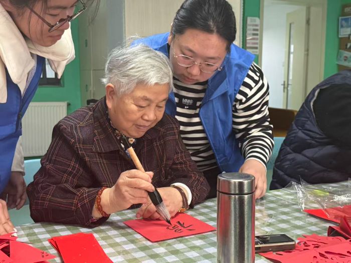 毛笔字创作环节,护理院的活动室里墨香四溢。薛雯雯提前备好大红宣纸、狼毫毛笔和研磨好的墨汁,看着老人们跃跃欲试的模样,她主动上前提供帮助。一位头发花白的奶奶颤抖着拿起毛笔,尝试了几次都未能蘸取合适的墨量,薛雯雯见状,立刻接过毛笔,轻轻蘸墨后又在砚台边缘刮去多余墨汁,再递回奶奶手中:“奶奶,这样墨就不会太多晕开啦,您握笔时手腕可以稍微放松一点。”她站在老人身旁,细心指导握笔姿势,用手指轻轻纠正运笔方向,“先顿笔,再慢慢行笔,最后收笔要轻”。在她的耐心引导下,老人们笔下的“福”字虽不算笔锋凌厉,却个个饱满圆润,透着满满的期盼。有位奶奶感慨道:“年轻时经常写毛笔字,老了眼睛花了就再也没碰过,今天多亏了你,让我又找回了当年的感觉。”薛雯雯笑着帮奶奶把写好的“福”字晾干,小心翼翼地铺在桌上,看着一张张红彤彤的“福”字铺满桌面,如同一片喜庆的花海,她仿佛看到了老人们心中对生活的热爱与憧憬。