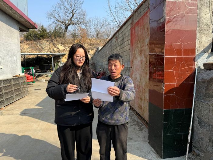 图为实践队员走访村民并填写调查问卷。李书仪供图