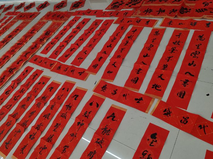 不多时,承载着文化气韵和满满祝福的春联一对对铺满社区的地面,吸引了不少居民驻足欣赏、挑选。“九龙破壁腾云起,八骏乘风载福来”,一对夫妻挑选了这样一副对联,希望新的一年不负良机,马到成功;社区居民们带走一幅幅写着“吉祥幸福家和顺,富贵平安好运来”的春联,彰显了中华民族对于“家和”的追求。不仅如此,居民还拜托书法老师们书写“定制春联”,将这份独特的美好带回家中。