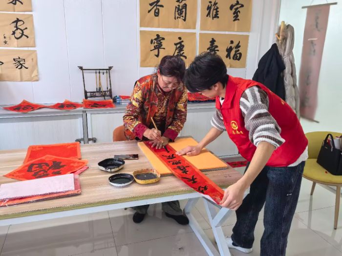 活动开始,志愿者们将早已备好的各式红色对联铺满桌面,调墨置笔,一应俱全。社区书法爱好者们挥毫泼墨,尽显功底。他们或写行草,笔势连绵、气韵流动间尽显生命力的蓬勃向上与岁月流畅,寓意旧年烦恼随风而逝,新年运势顺畅无阻;或写隶书,庄重典雅,浑厚圆润,让文字中的祝福显得更为笃实、恒久;还有行书、楷书……在书法老师们一笔一划间,喜庆祥和的春节气息处处洋溢。