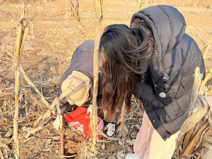 图为实践队员在玉米地中协助劳作,同时调研耕地利用实际情况。盛文婧供图