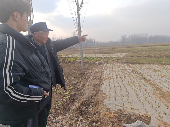图为实践队员与村民在田边交流,调研土地整理与利用现状。张韶涵供图