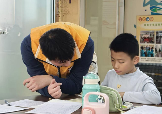 最后进行作业辅导。孩子们首先认真填写了冬令营学习情况记录表中的基本信息与个人学习计划,随后在志愿者的一对一耐心指导下攻克课业难题。志愿者们因材施教,针对不同孩子的学习特点提供精准帮助,不仅助力孩子们高效完成作业,更注重培养他们自主学习的良好习惯。
