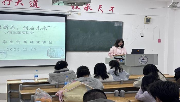 2025年11月25日19时,电气学生创新创业协会、菁英学生学习会、学生电子科技协会和晖虹学生文学社在濂溪校区教学楼128举办“雪蕴新思,创启未来”主题演讲活动,此次活动大约50名同学参加。